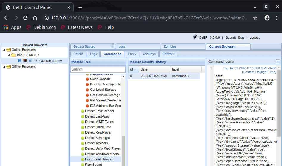 Alongside the basic data shown on the hooked browser’s main screen (see previous figure), many modules are available to fingerprint the victim and establish persistence, among which are: