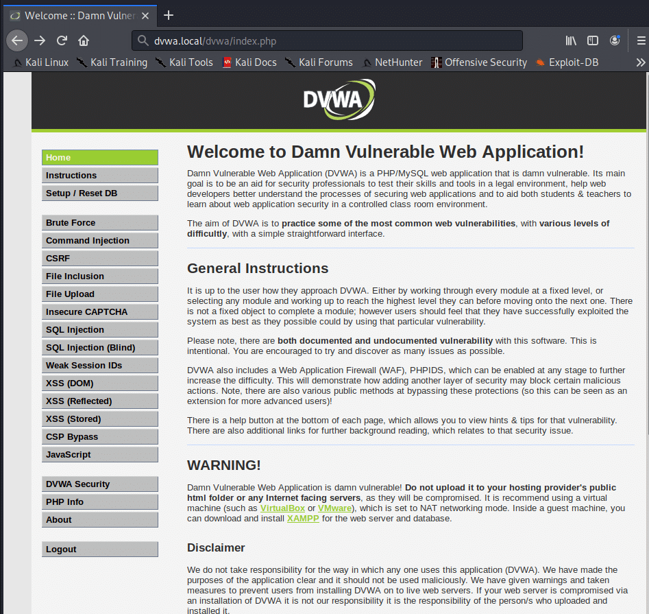 On the BeEF server, we set up a proxy as shown above, and configured Firefox to use it. Now, when we access the DVWA website, we are not prompted with the login screen – because we’re browsing in the victim’s security context: