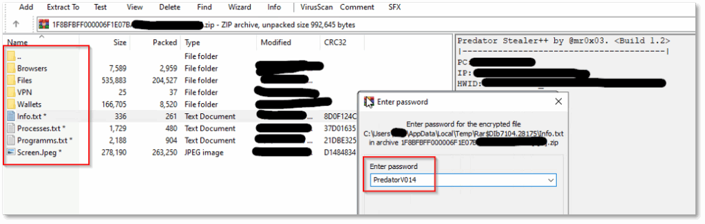 After collecting all the data, Predator Stealer compresses it into a password-protected ZIP archive: