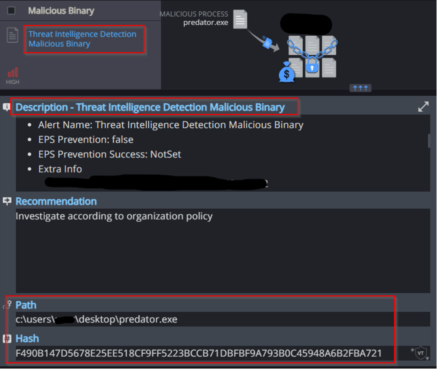 Cynet’s AV engine detects that a malicious file was dumped on the disk: - Threat Intelligence Detection Malicious Binary