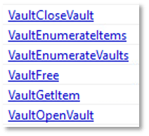 The file may leverage Windows Vault API functions to access and extract stored credentials and sensitive information from the system vault: