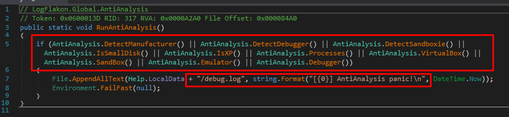 Predator Stealer is designed to employ a series of anti-analysis techniques to determine whether it is being monitored or executed in a controlled environment. It contains the option to check for the presence of remote debuggers, virtual machines, emulators, and sandbox environments. Additionally, it can scan for specific processes running on the host system that may indicate analysis or detection tools. If the Stealer detects that it is being analyzed, it logs this event to a log file:
