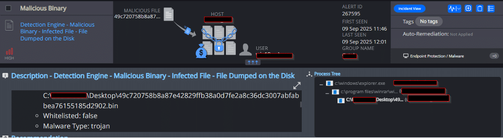 Cynet’s AV/AI engine detects that malicious files were dumped on the disk or are attempting to run: - Threat Intelligence Detection Malicious Binary