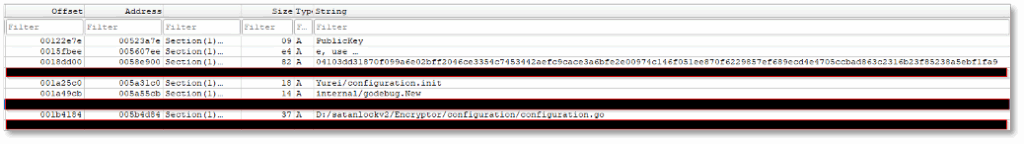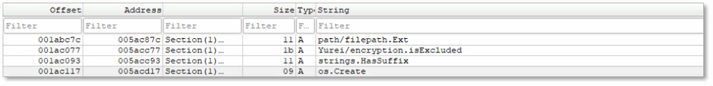 The malware leverages path/filepath.Ext and strings.HasSuffix to identify files by extension, enabling selective targeting of user data. The presence of Yurei/encryption.isExcluded indicates built-in exclusion logic, likely to avoid system-critical files. Use of os.Create confirms that new files are generated during execution, consistent with creating encrypted versions of victim files or ransom notes. These strings collectively point to a structured ransomware workflow focused on controlled, selective encryption.