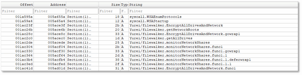 - The repeated references to Yurei/filewalker.EncryptAllDrivesAndNetwork and Yurei/filewalker.getNetworkRoots demonstrate that the malware is designed to enumerate and encrypt not only local drives but also network shares.