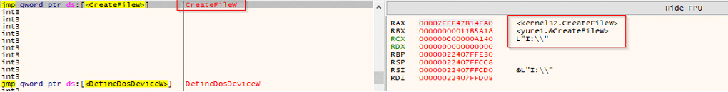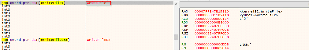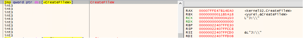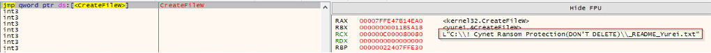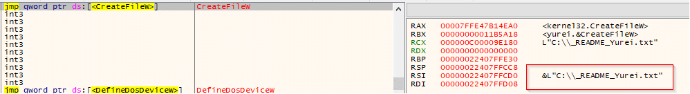 While paused on kernel32.CreateFileW, the path in RCX was L”C:\_README_Yurei.txt”, evidencing creation of the ransom note in the system drive root. This event occurred immediately after the drive-letter sweep, marking the transition from reconnaissance to user-facing impact. Additional strings visible in memory (e.g., L”inetpub”) indicate the sample may also stage notes in prominent directories (such as IIS paths) for visibility, while L”a:” reflects the ongoing A:–Z: enumeration context.