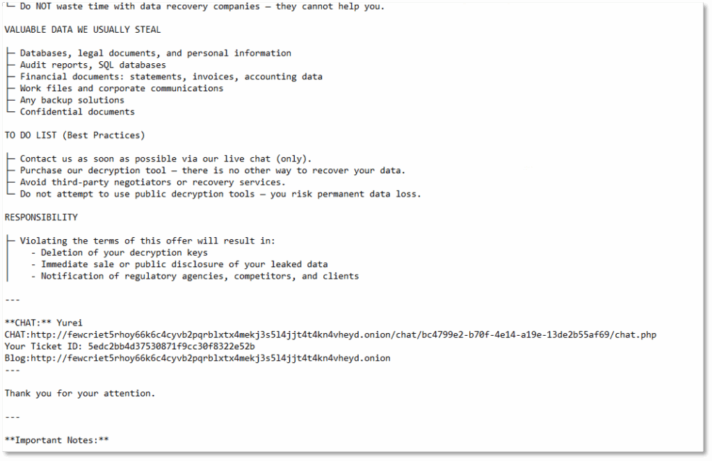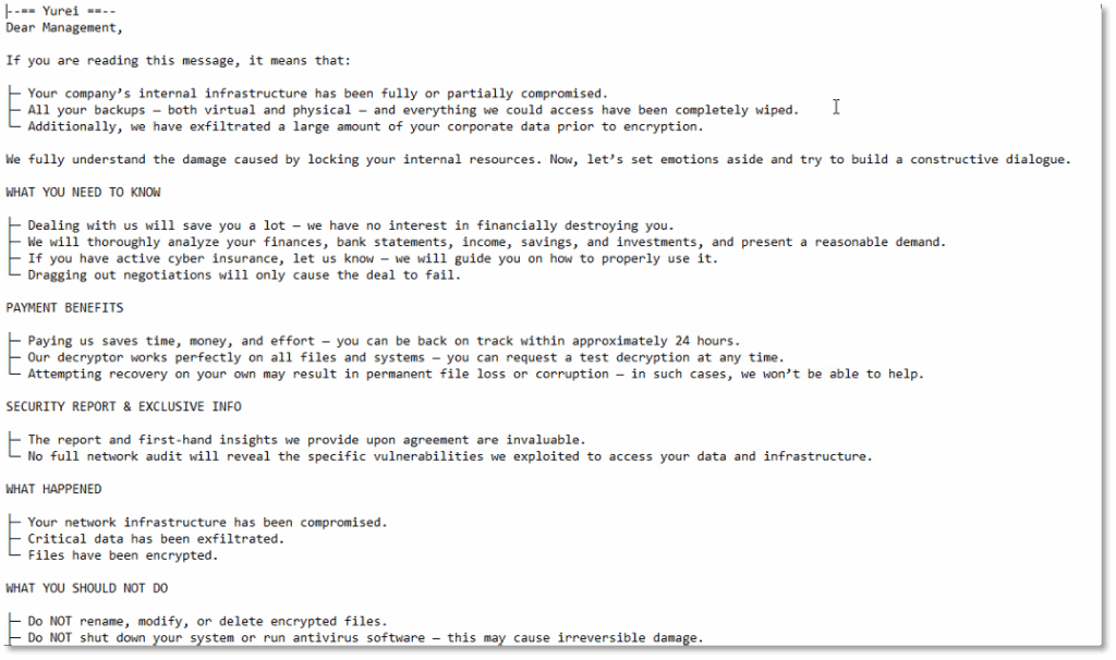 First observed in September 2025, Yurei is a ransomware group that leverages double extortion tactics – encrypting victims’ files while also stealing sensitive data – then demands payment to decrypt files and prevent the release of stolen information.