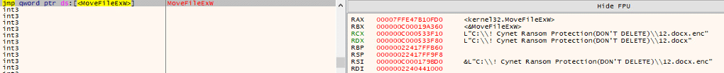 While paused at kernel32.MoveFileExW, the call referenced C:\! Cynet Ransom Protection (DON’T DELETE)\l2.docx and C:\! Cynet Ransom Protection (DON’T DELETE)\l2.docx.enc, showing a rename/swap between the original decoy and its encrypted counterpart. This is the encryption commit step typical of ransomware after writing the encrypted data, it atomically moves/renames the file to the .enc extension and it confirms the sample is acting on Cynet’s ransomware-protection decoys as intended.