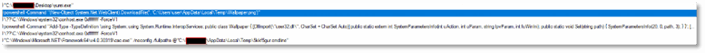 After the encryption phase completes and ransom notes are created, the malware launches PowerShell to inline-compile a small C# helper (via csc.exe and cvtres.exe) and calls user32.SystemParametersInfo to set C:\Users\user\AppData\Local\Temp\Wallpaper.png as the desktop background. This powershell.exe → csc.exe → cvtres.exe sequence occurs at the end of execution as part of the ransom UX, broadcasting the change only after files have been encrypted.