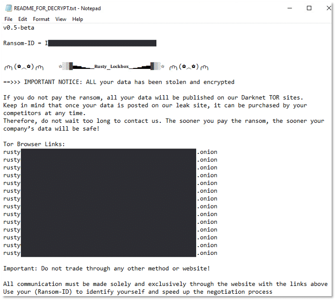 Rusty Lockbox (also known as Rusty Locker) is a Rust-based double-extortion ransomware that combines aggressive encryption with pre-encryption data theft to pressure victims into paying ransom demands. The malware incorporates extensive anti-analysis and sandbox evasion techniques, deletes local backups to prevent recovery, and terminates services and applications that may interfere with file encryption. Rusty Lockbox demonstrates how modern ransomware increasingly prioritizes stealth, resilience, and operational reliability, while leveraging Rust for performance and cross-platform potential.