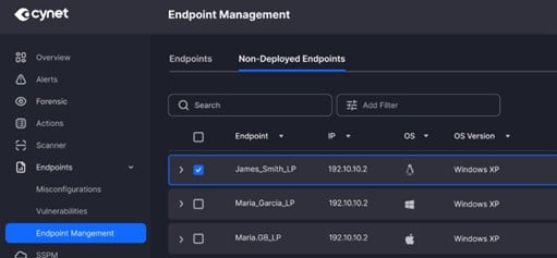 Detects M365 endpoints without the Cynet Agent deployed, to close coverage gaps. Displayed is the endpoint name, ID, OS, OS version, Discovery type, Cynet Agent status, and when the endpoint was last seen.